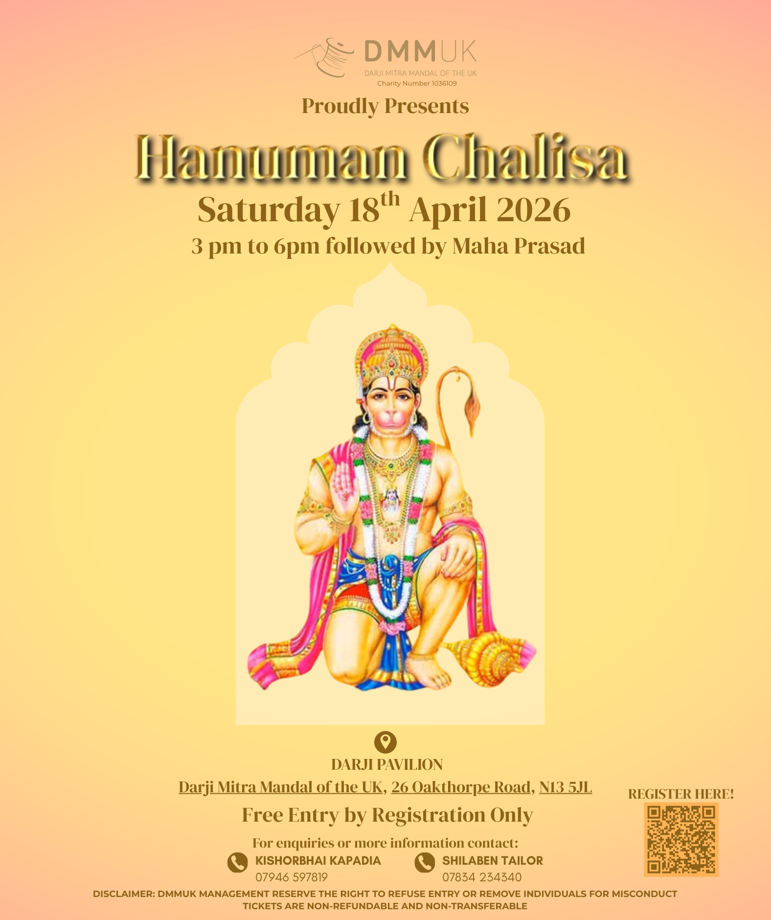 Darji Mitra Mandal of the UK (DMMUK) warmly invites you and your family to a spiritually uplifting Hanuman Chalisa event—an afternoon of devotion, unity, and divine blessings.